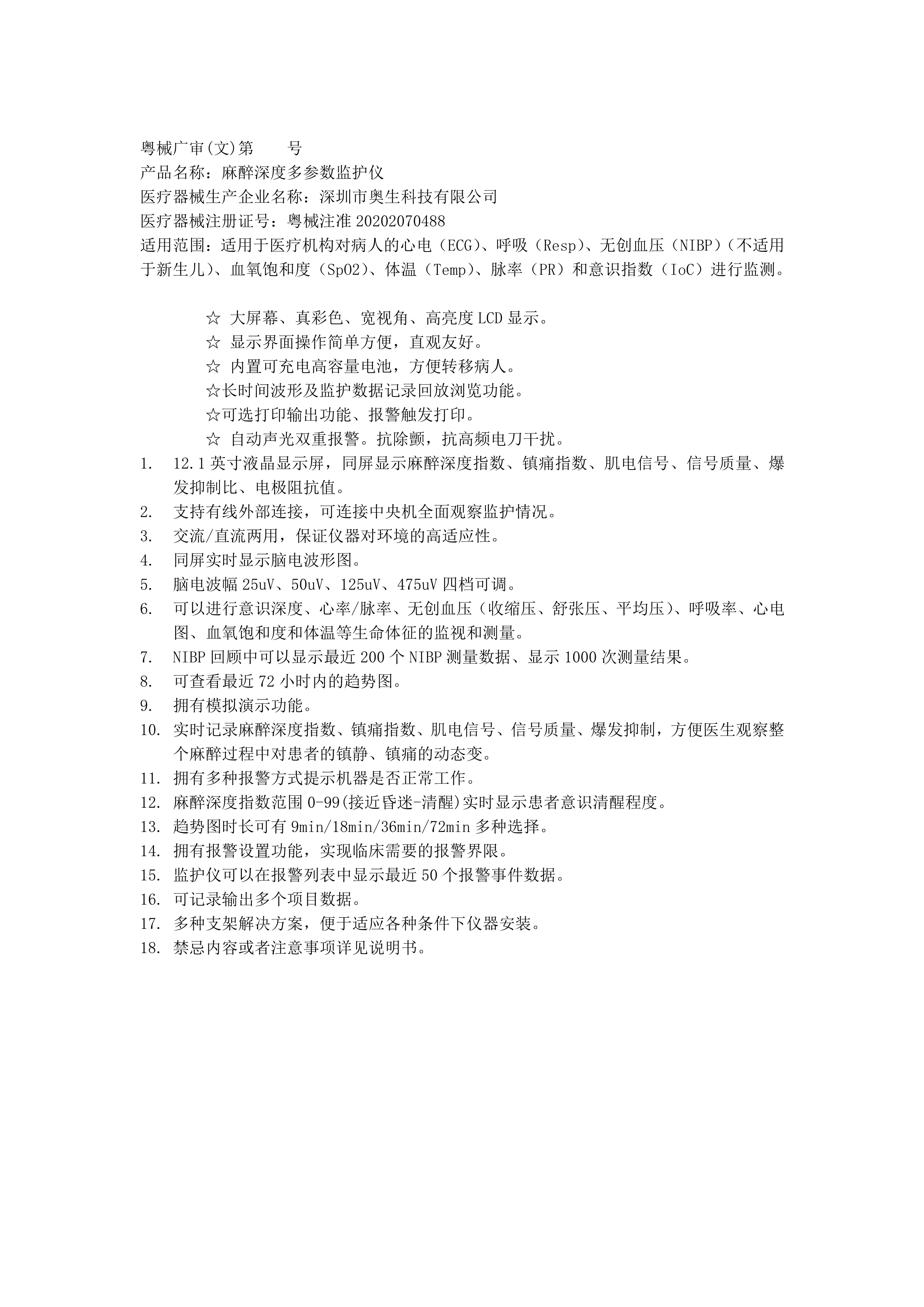 深圳市奥生科技有限公司麻醉深度多参数监护仪广告批准