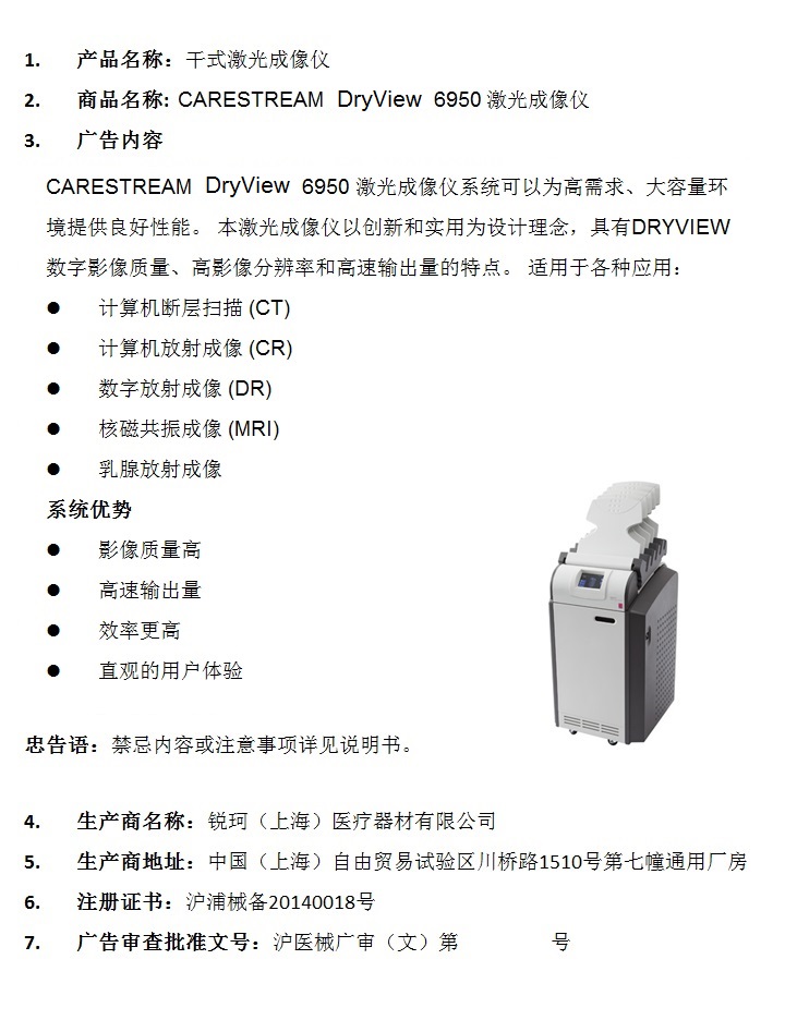 锐珂(上海)医疗器材有限公司干式激光成像仪广告批准