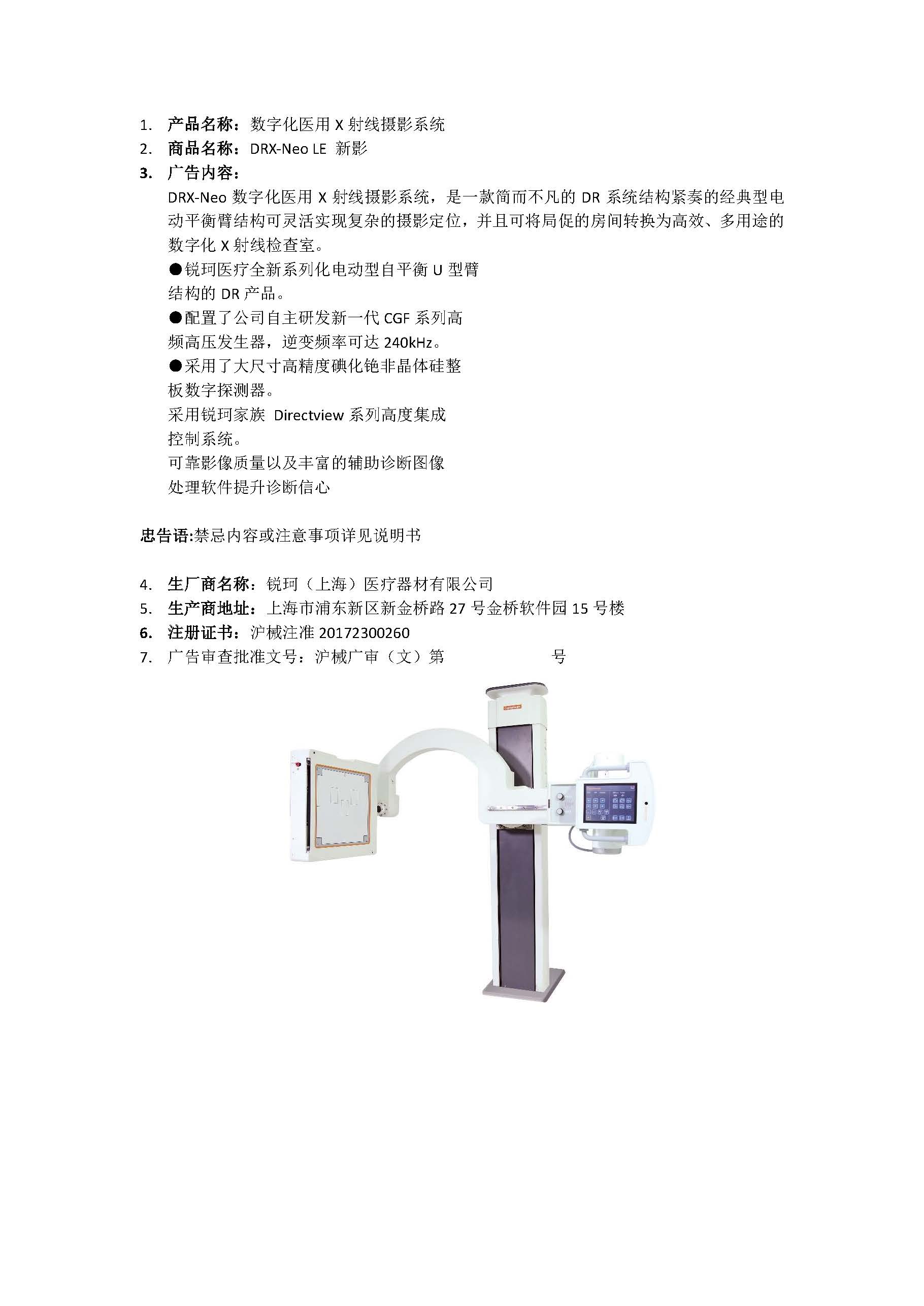 锐珂(上海)医疗器材有限公司数字化医用X射线摄影系统广告批准