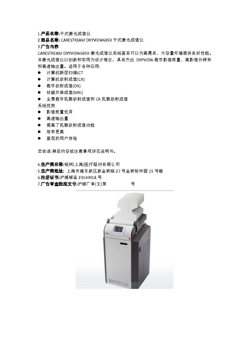 锐珂(上海)医疗器材有限公司干式激光成像仪广告批准