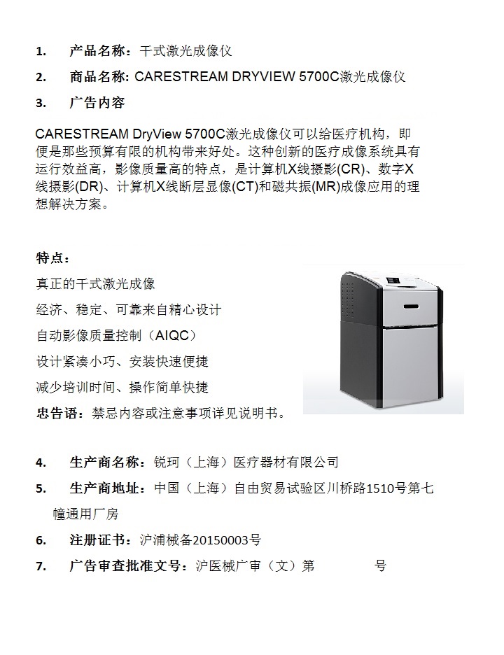锐珂(上海)医疗器材有限公司干式激光成像仪广告批准