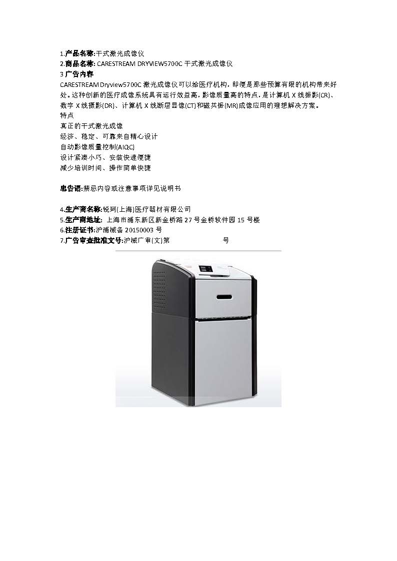 锐珂(上海)医疗器材有限公司干式激光成像仪广告批准